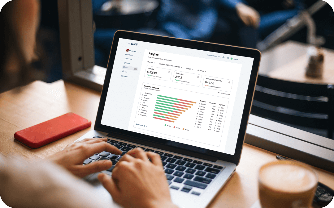 Estimated savings are calculated based on: (a) User-provided information; (b) Manual order entry into a venue’s point of sale system taking 60 seconds per order; (c) An average menu size of 86 menu items and menu changes taking 90 seconds for each menu item. Content change (38 times per month) and menu item availability changes (154 times per month); (d) Costs of refunds due to entry mistakes using a 6% order error rate and the average value of a refund being $22 ; (e) Labour costs using a fully loaded hourly rate of $42.69; (f) Doshii’s 0.37% failed order ratio for unprocessed POS orders.